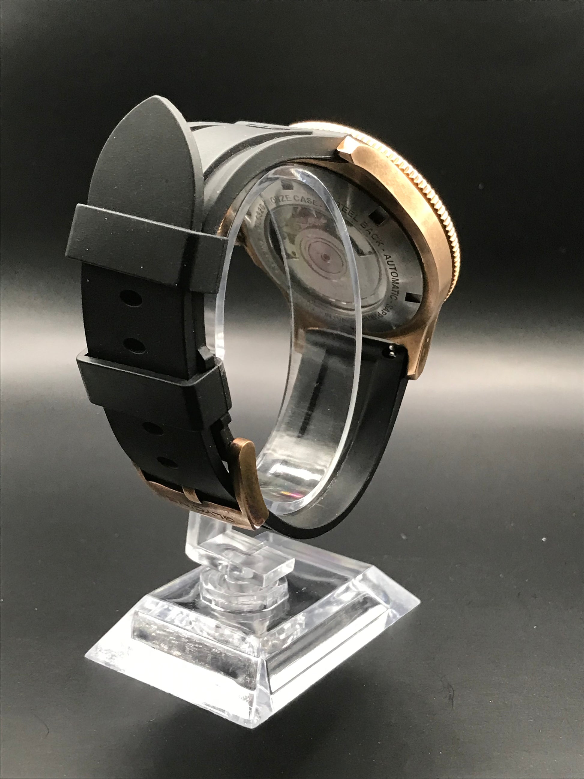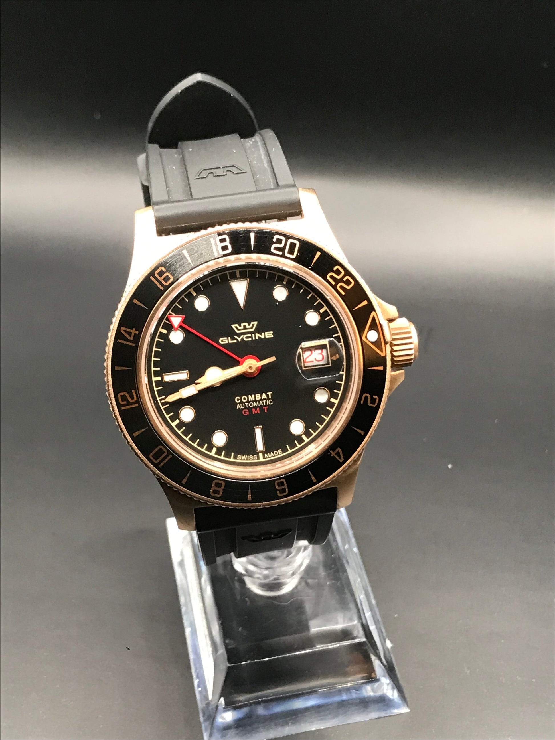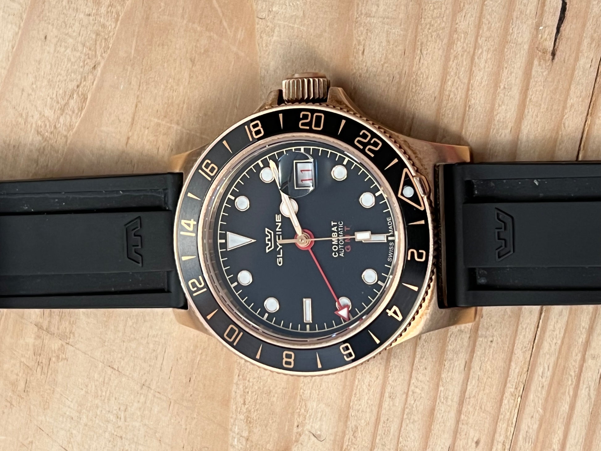Entirely hand finished and Made in Switzerland, the watch is satin brushed throughout to a very high standard, again synonymous with Glycine. Bronze patinates naturally as it oxidises neatly throughout, so that each watch will take on a unique finish over time. First for the CombatSUB to clad a GMT bezel, The 48 clicks bidirectional rotating bezel clicks positively in place with little play for added confidence. The bezel featured a beautiful two-tone black and grey hues, with 24 hours makers labelled around. The CombatSUB is water resistant to a modest 200m.