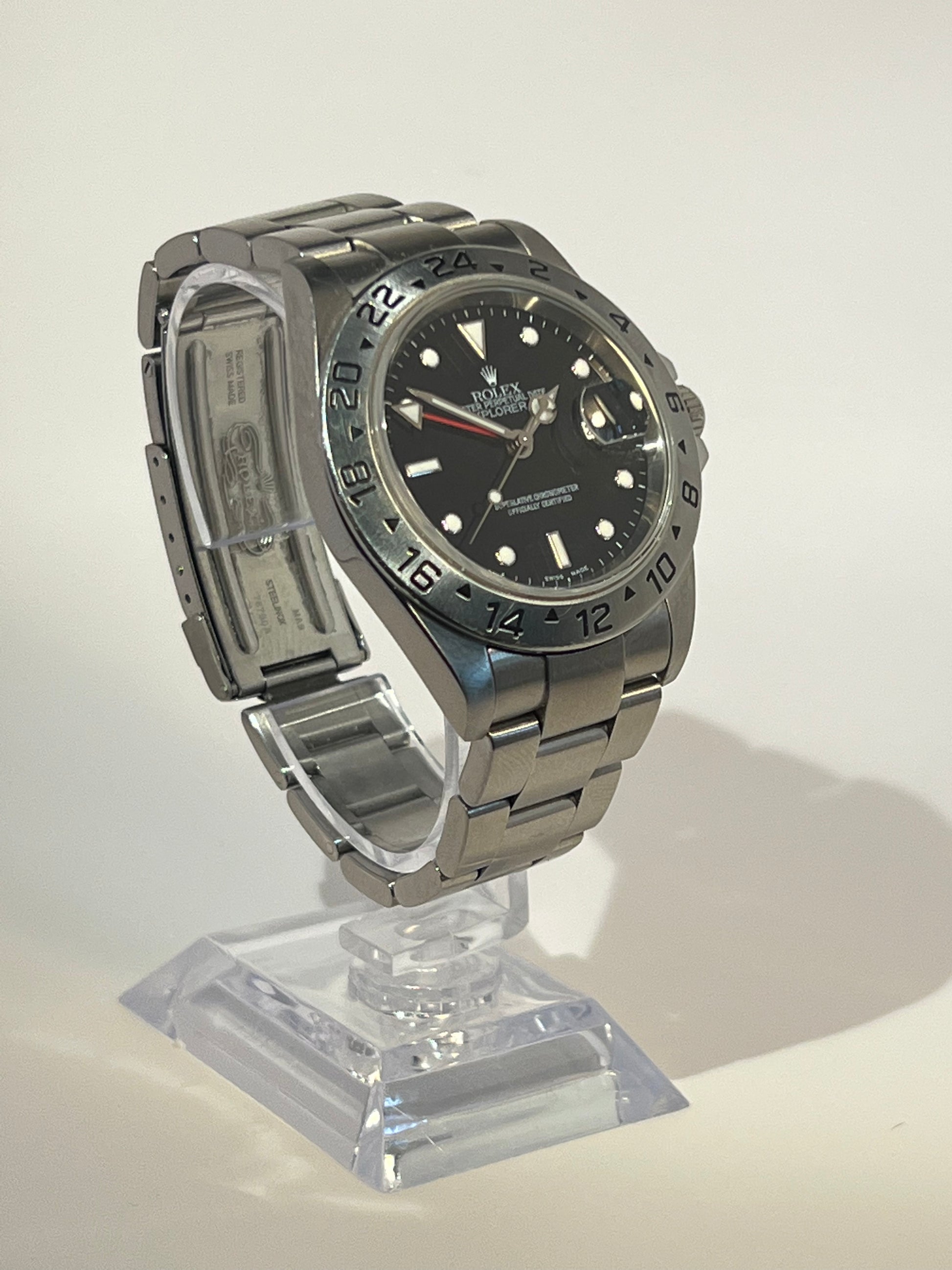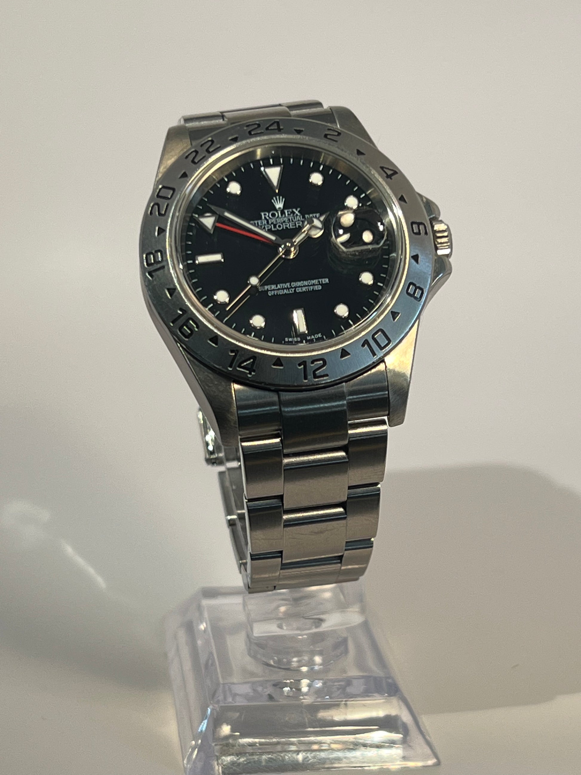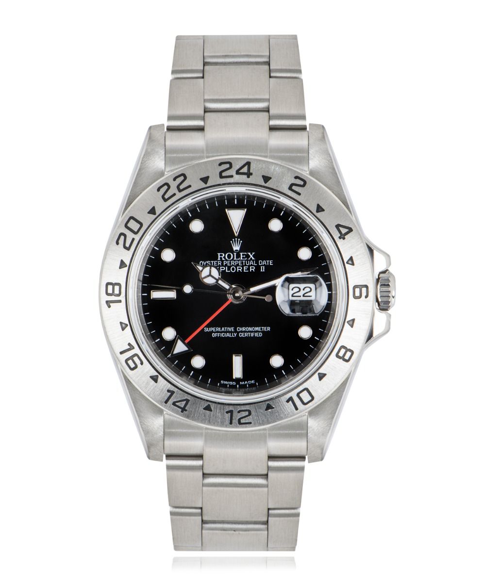 The Explorer II features a glossy black dial with applied luminescent indices, date aperture at three, and a fixed numbered GMT bezel. The previously polished case remains free of any noteworthy imperfections and is mounted on a stainless steel Oyster bracelet in equally nice condition. The bracelet remains at 90% with very little stretch and no obvious signs of wear. As configured the watch will accommodate a 7-inch wrist. Powering the 16570 is an automatic Rolex caliber 3185 with an approximate power reserve of 50-hours.