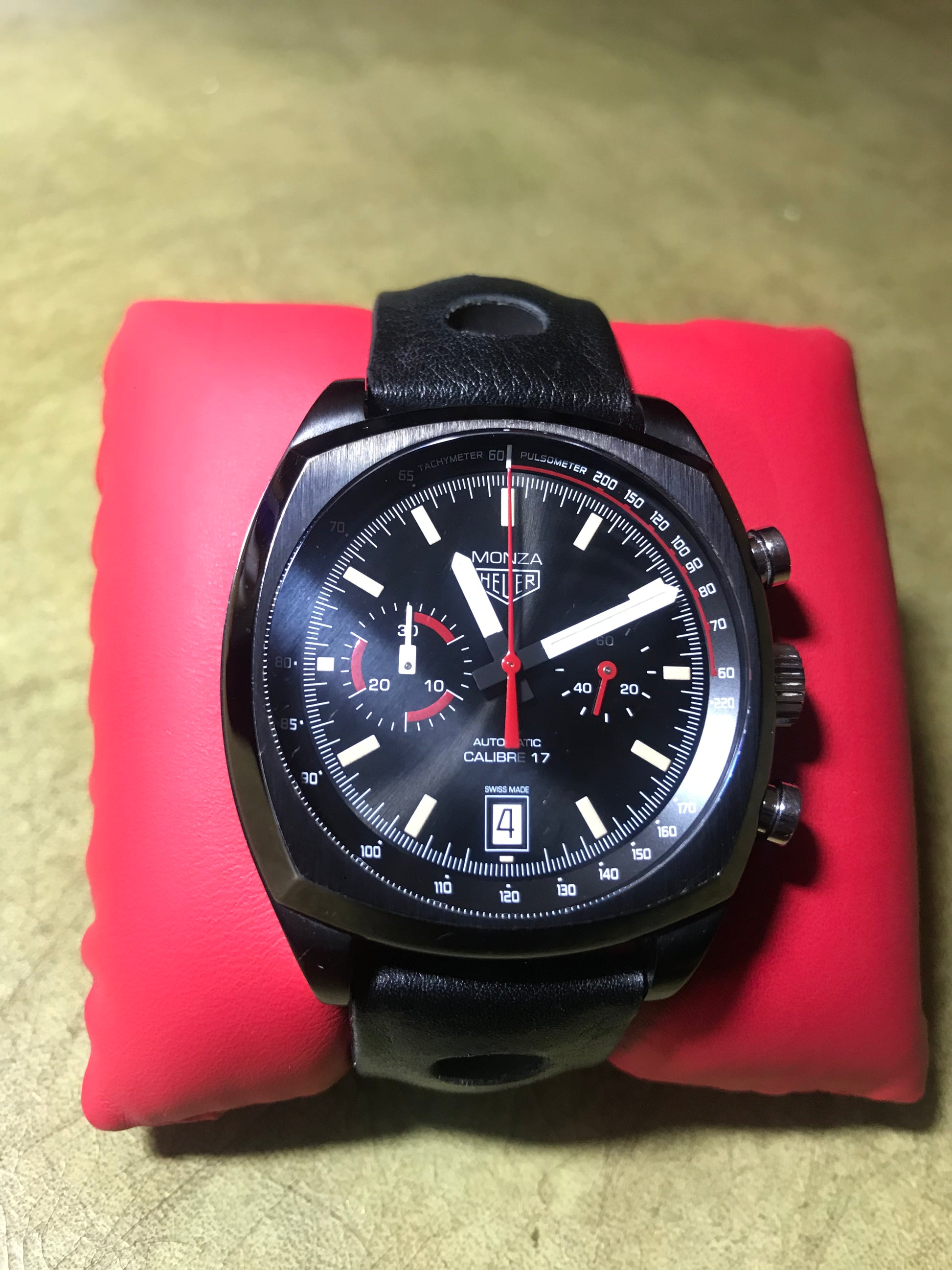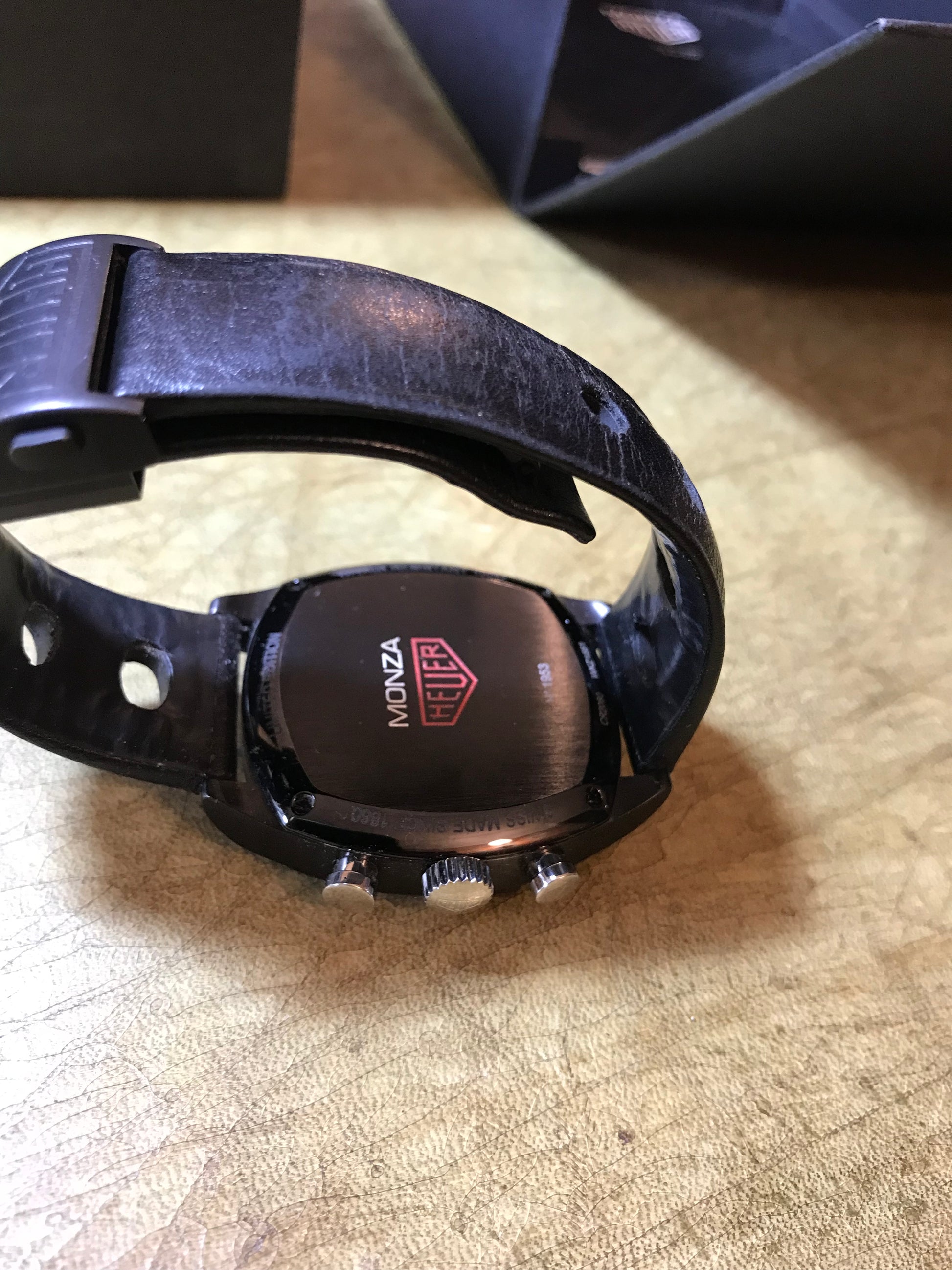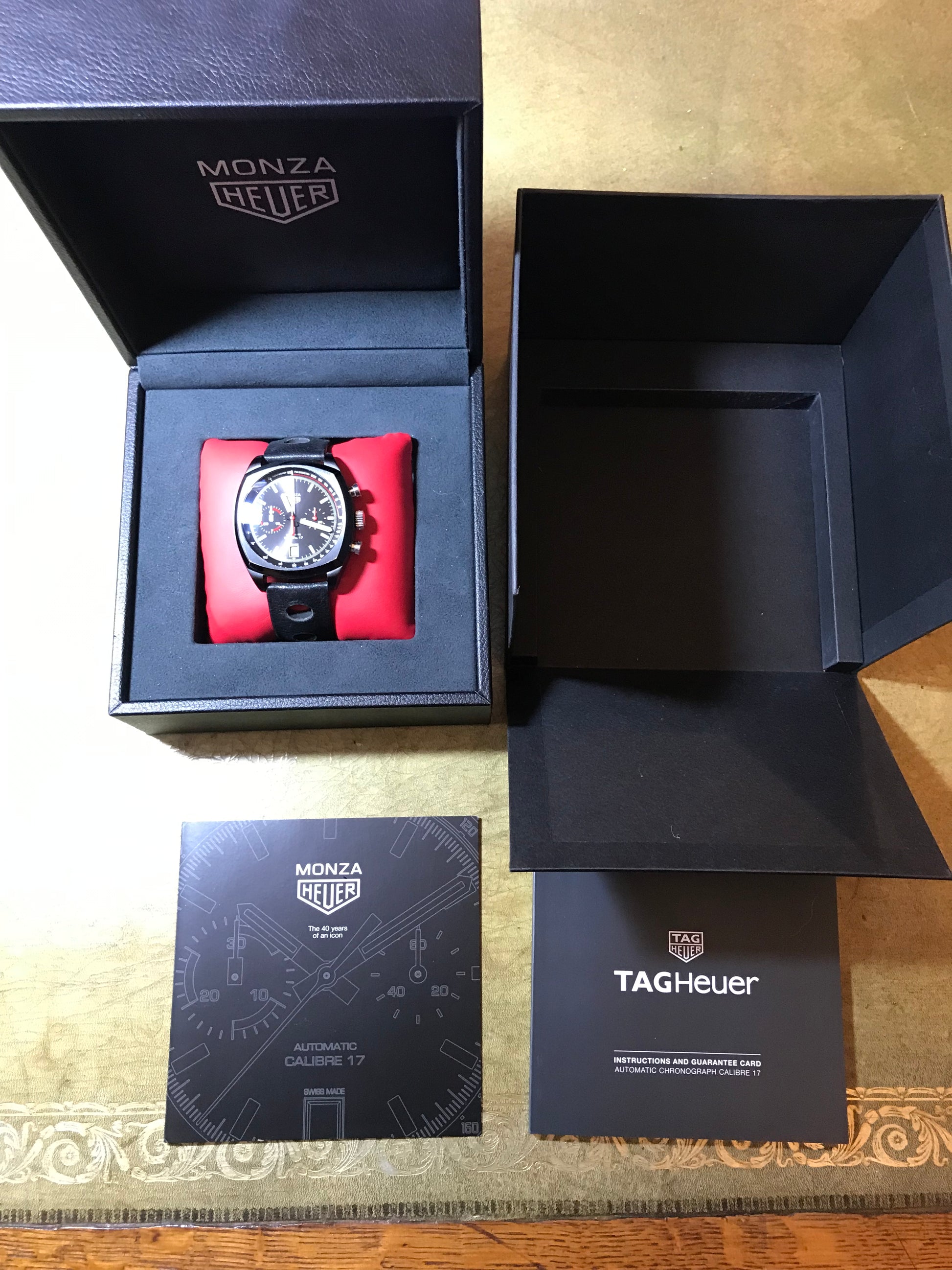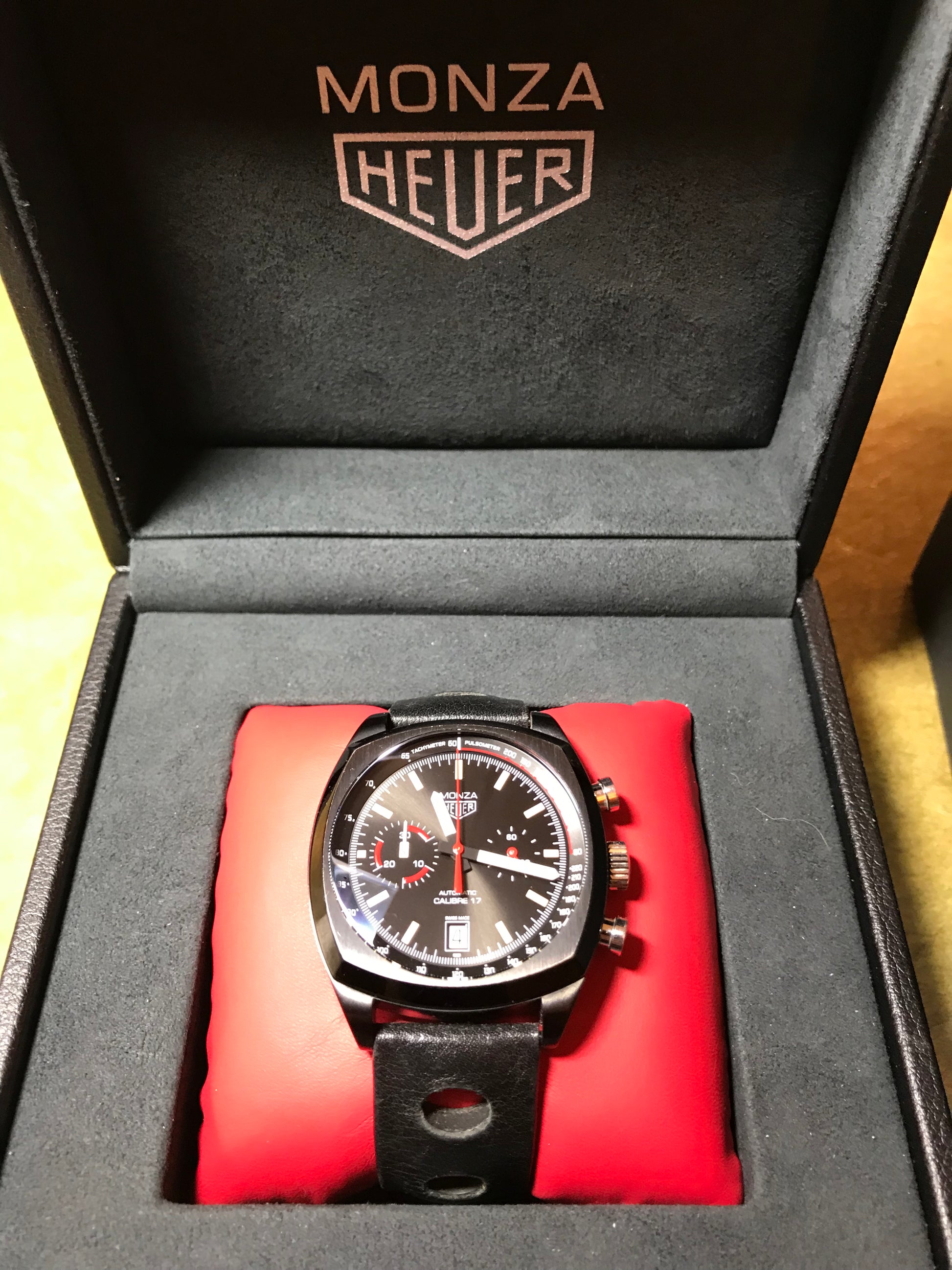 From the HEUER Heritage collection, this Monza is a numbered edition (not limited). The Heuer shield logo is printed on the dial, engraved on the crown & engraved with red fill on the case back. Special branded MONZA HEUER box.