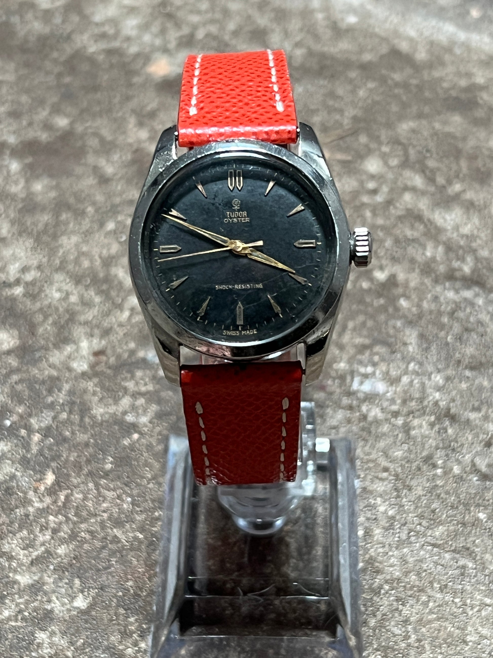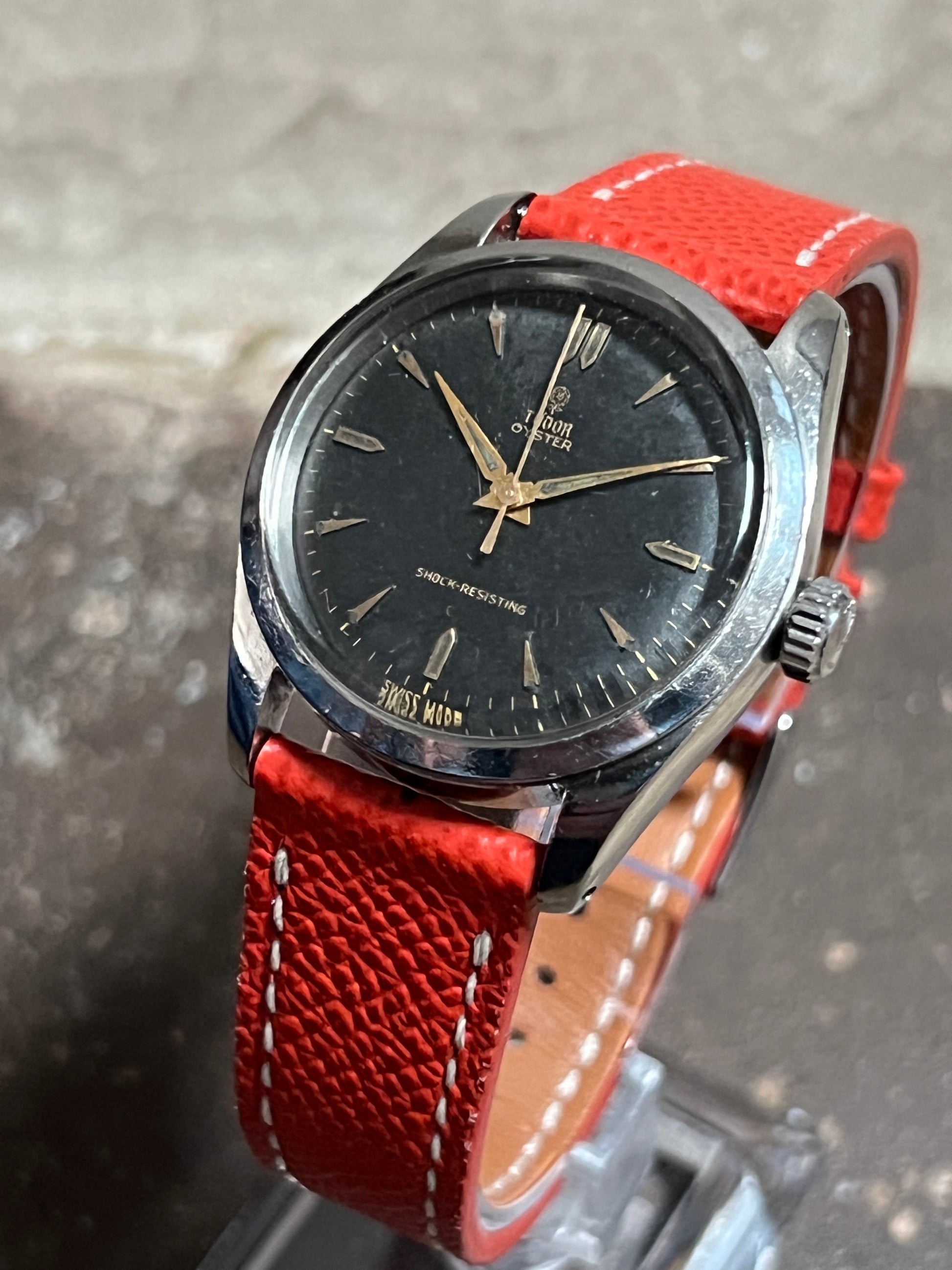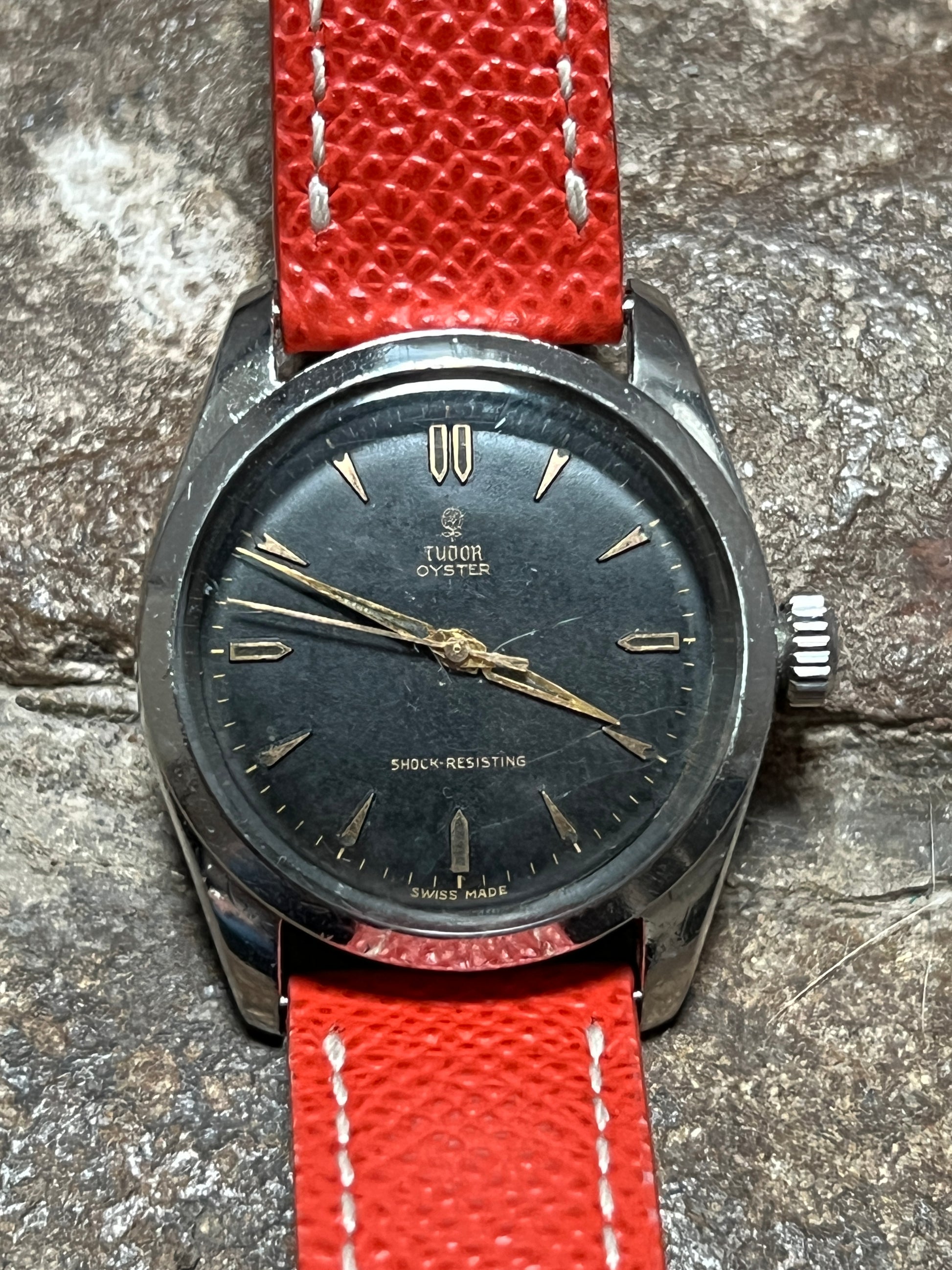 Tudor Oyster model 7904, Shock-Resisting stainless steel gentleman's wristwatch, circa early 1950s. Black dial with gold dagger hour markers, minute markers, cal. 1182 17 jewel movement, red leather strap, 34mm. Watch is a manual wind and is in working order keeping good time.