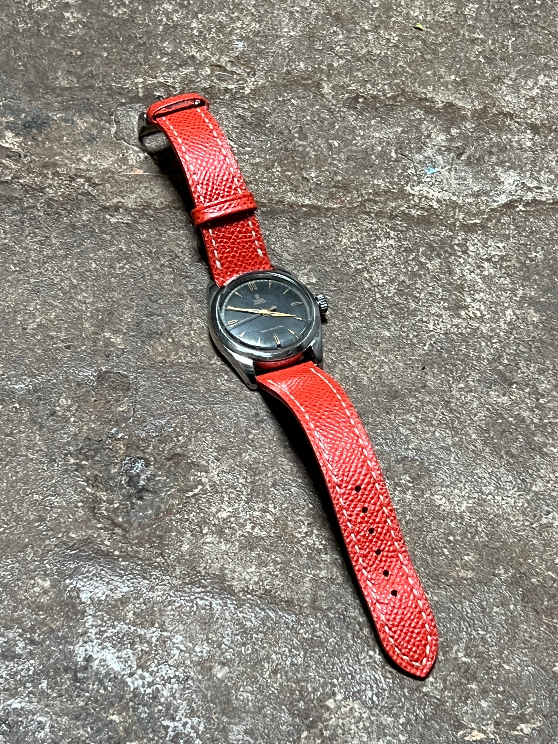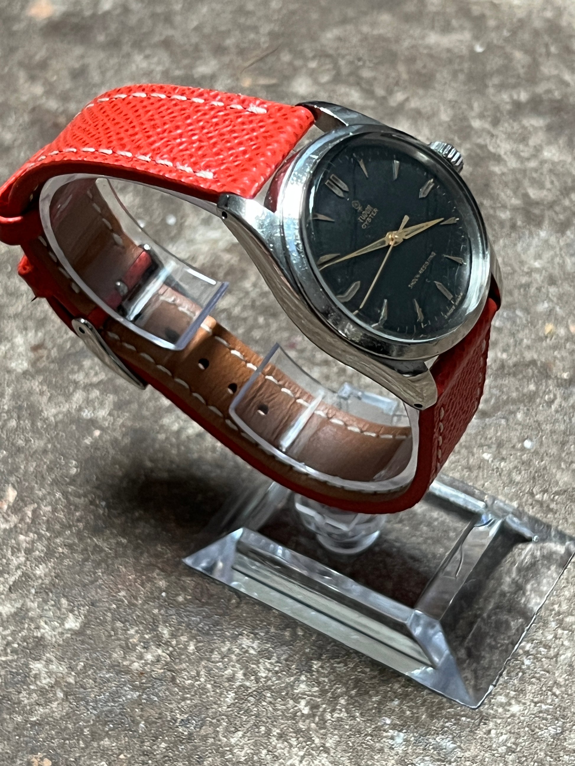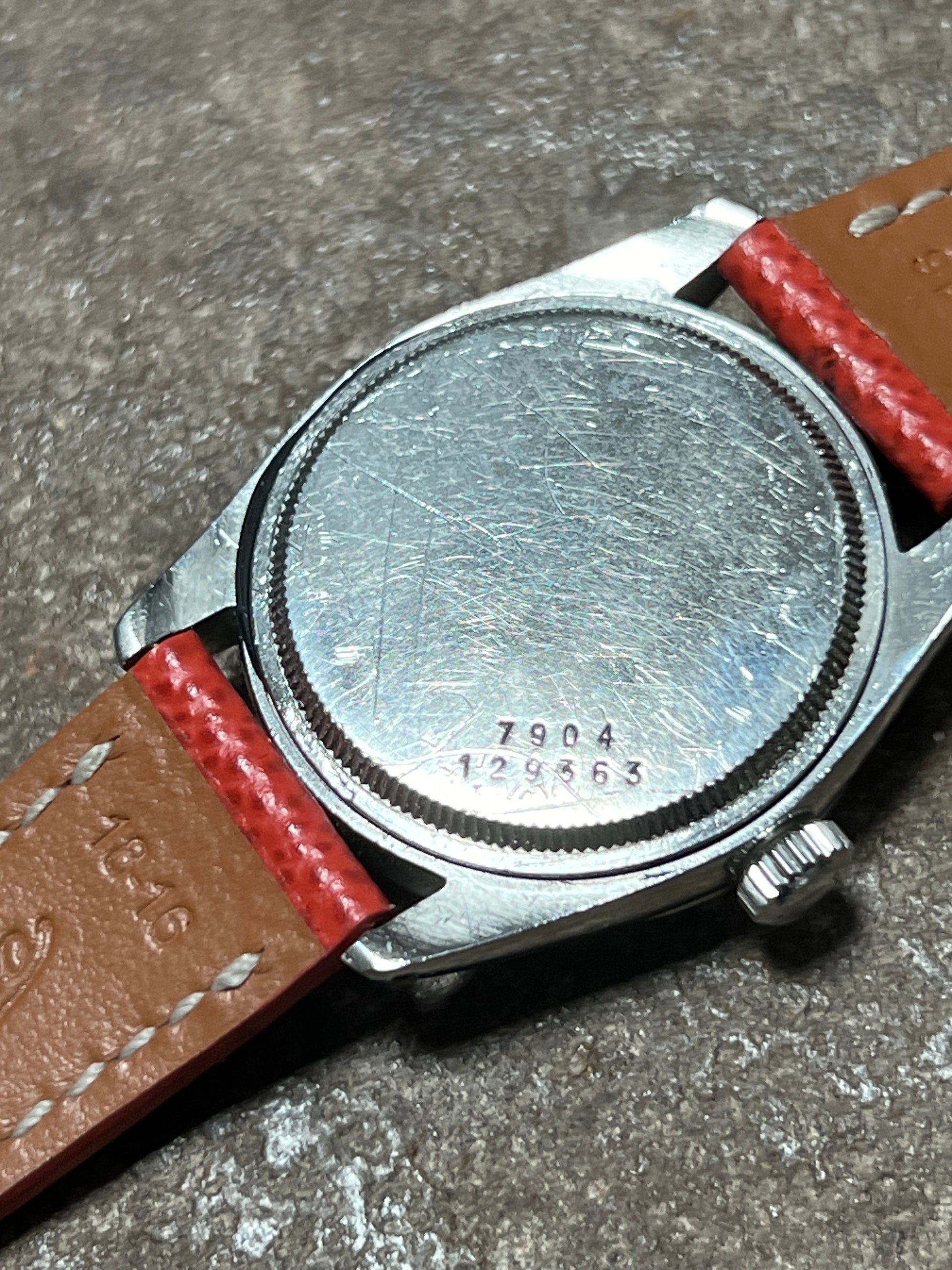 Tudor Oyster model 7904, Shock-Resisting stainless steel gentleman's wristwatch, circa early 1950s. Black dial with gold dagger hour markers, minute markers, cal. 1182 17 jewel movement, red leather strap, 34mm. Watch is a manual wind and is in working order keeping good time.
